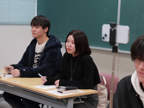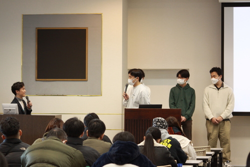 「こんなにたくさんの人の前で話すのは初めてでちょっと緊張しました」と話す学生たち。