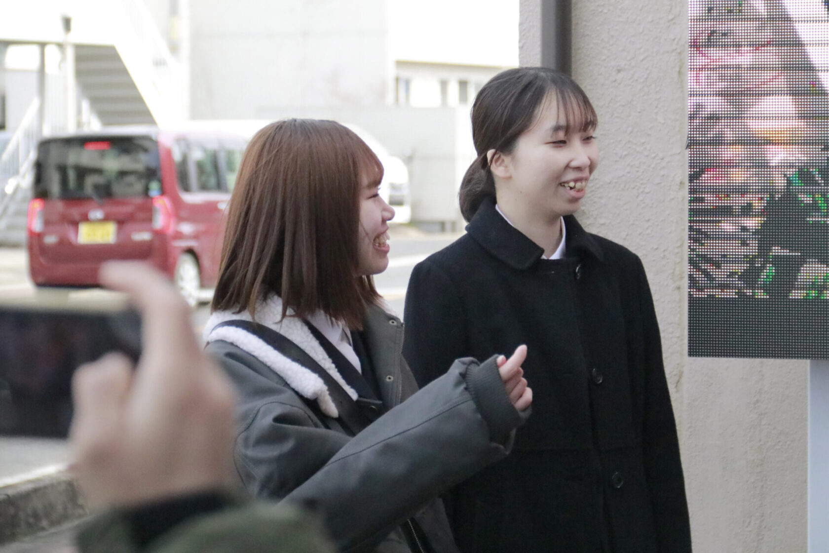 さっそく学校近くのデジタルサイネージで確認!自分たちの動画は実際に使われているところを見ると嬉しいですよね!