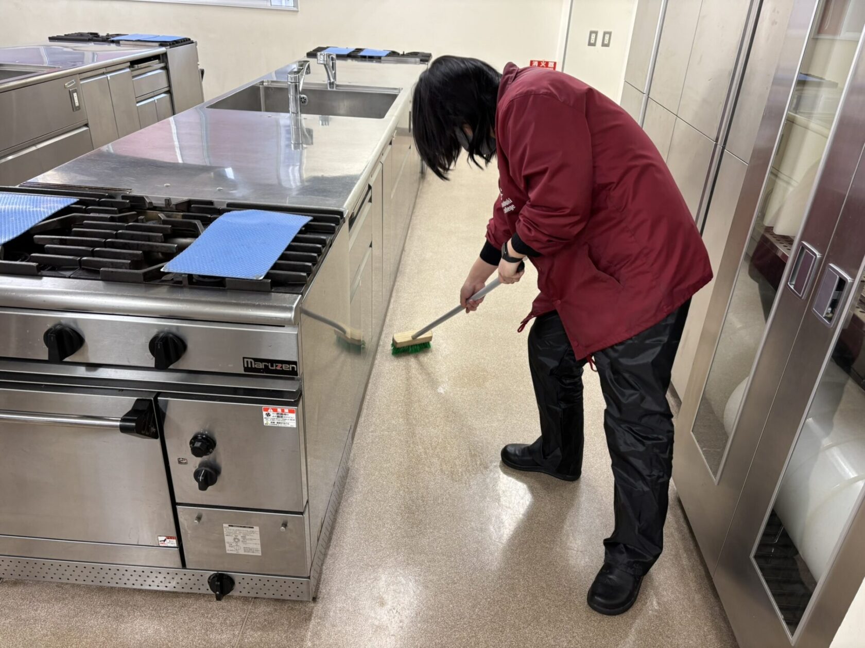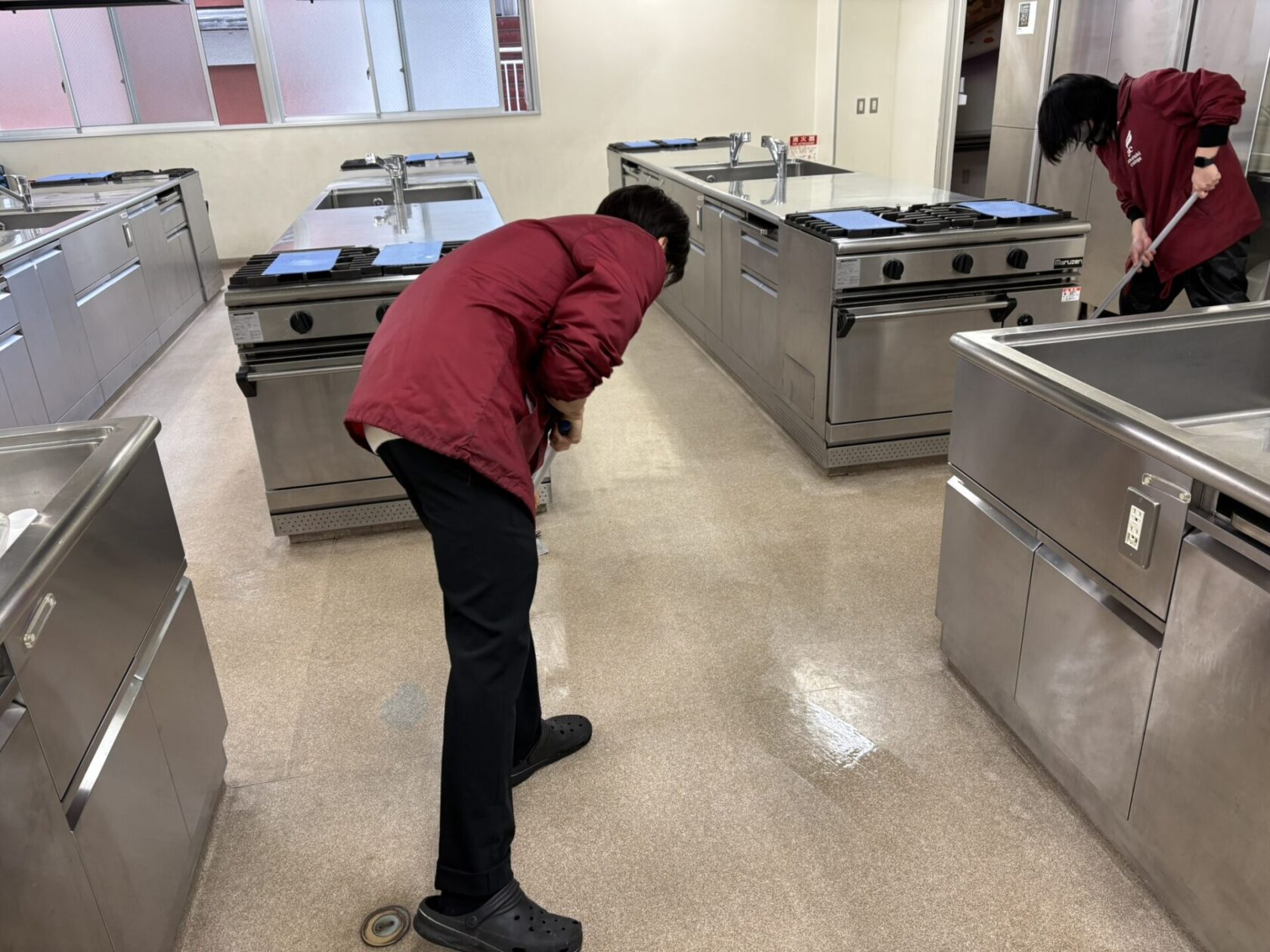 校舎へおじゃますると、先生たちがゴシゴシと床を掃除していました。