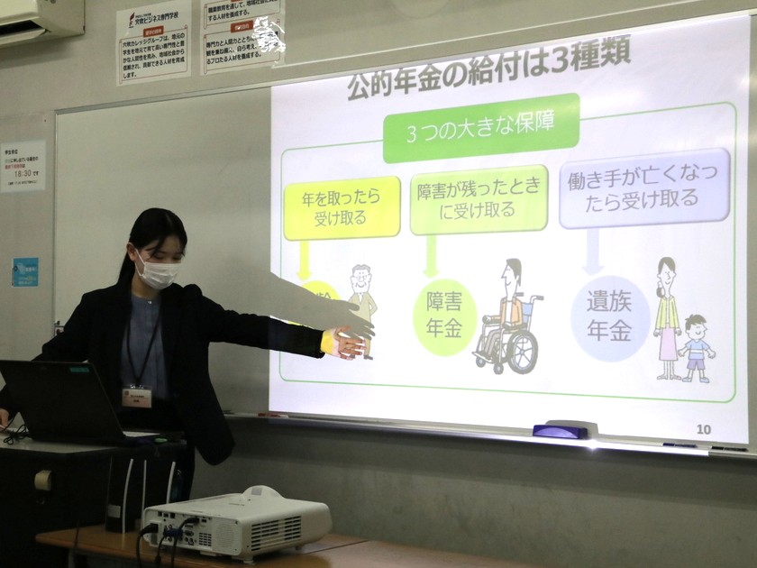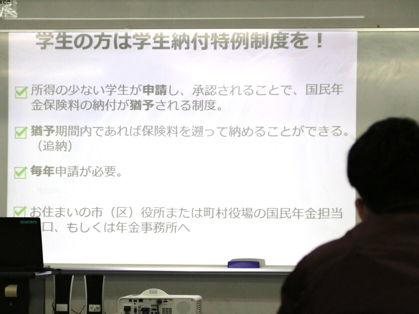 今回の講演会では、職員の方々が動画や分かりやすいスライドを用いて、年金制度の概要から、将来必要となる資金、具体的な納付方法、さらには学生向けの猶予や免除制度まで、幅広い情報を丁寧に解説してくださいました。