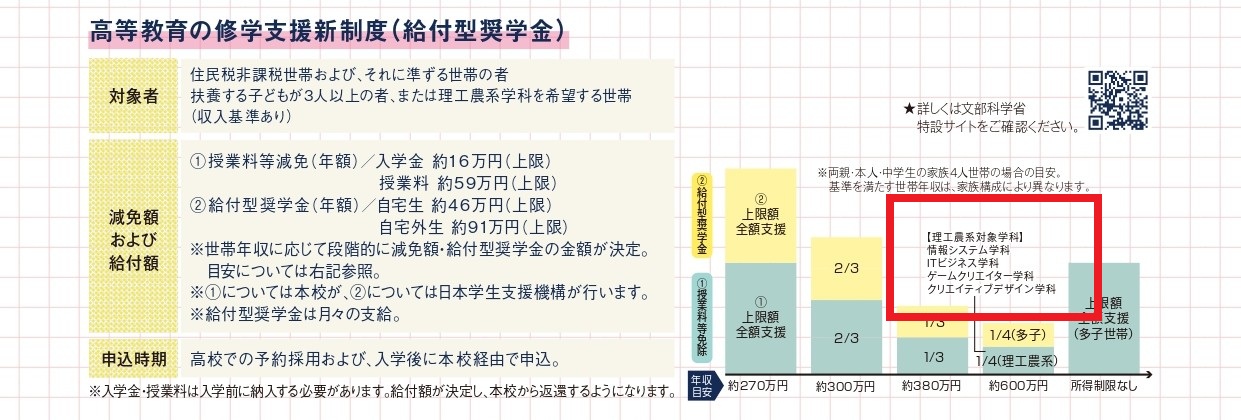 ご自身の修学支援新制度の対象区分にご不安をお感じの保護者様、高校生の皆様には、オープンキャンパス等の個別相談にてご説明させていただきます。また、今後実施する入試説明会など、出願関連イベントでも改めてご案内を徹底してまいります。