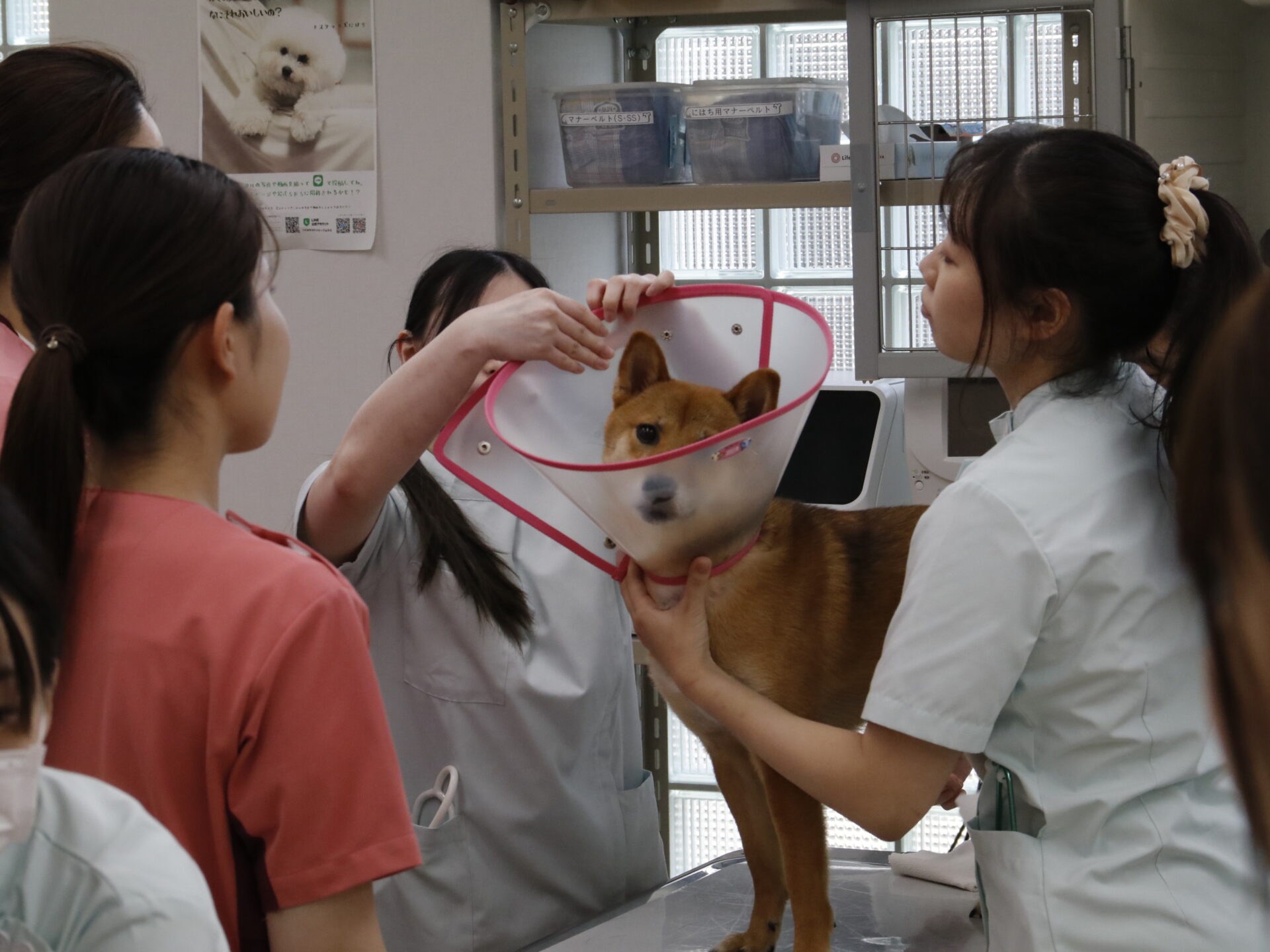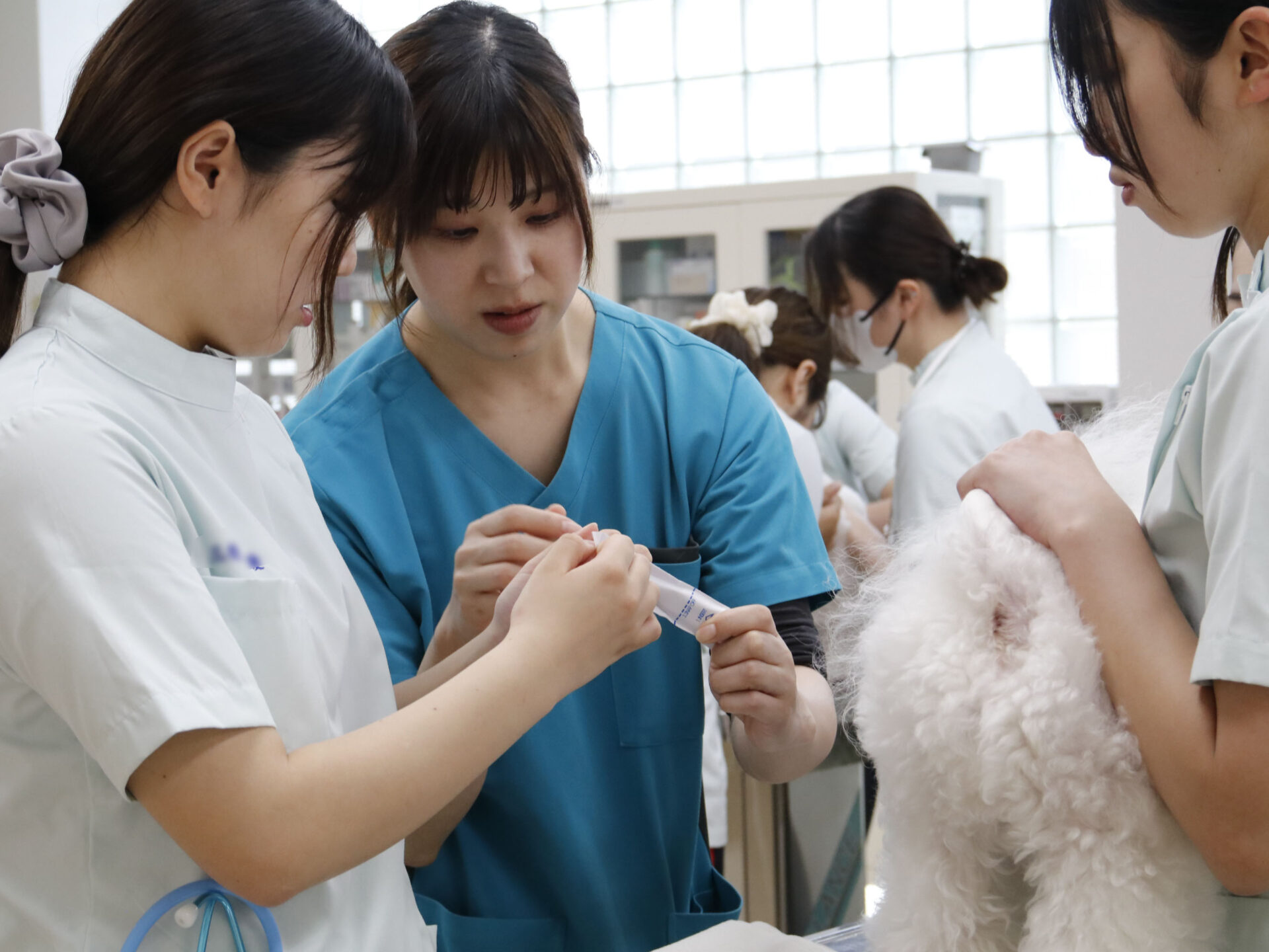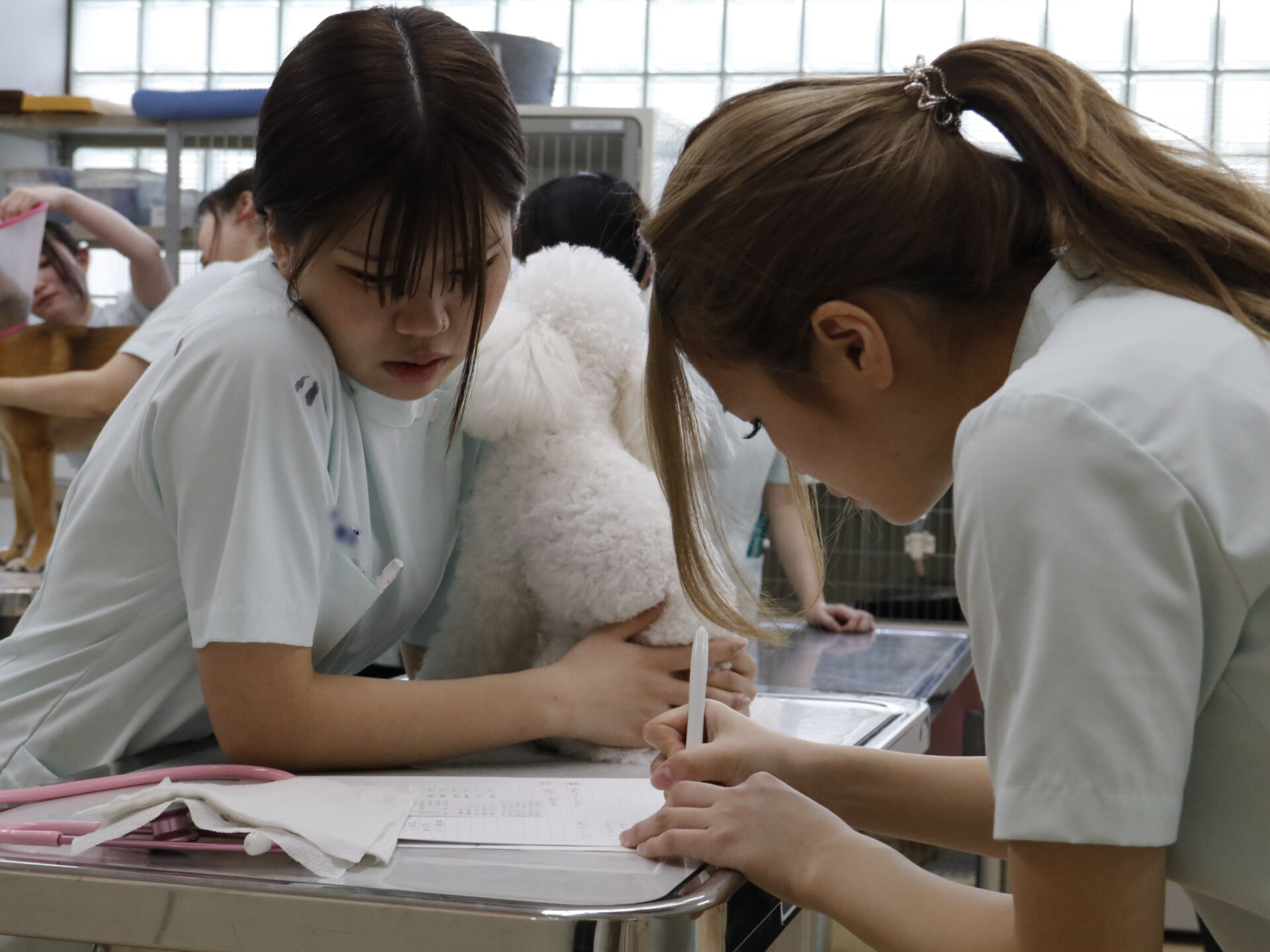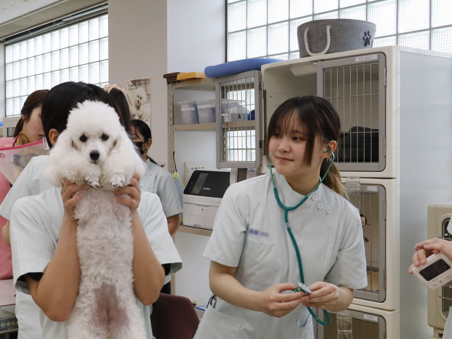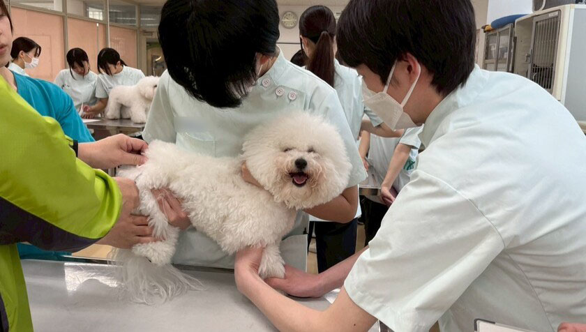 動物看護総合学科では、スタッフ犬に協力してもらい、実際に動物病院で使用する器具を使用して授業を行い、動物看護師として即戦力で活躍できる技術を身に付けています。
