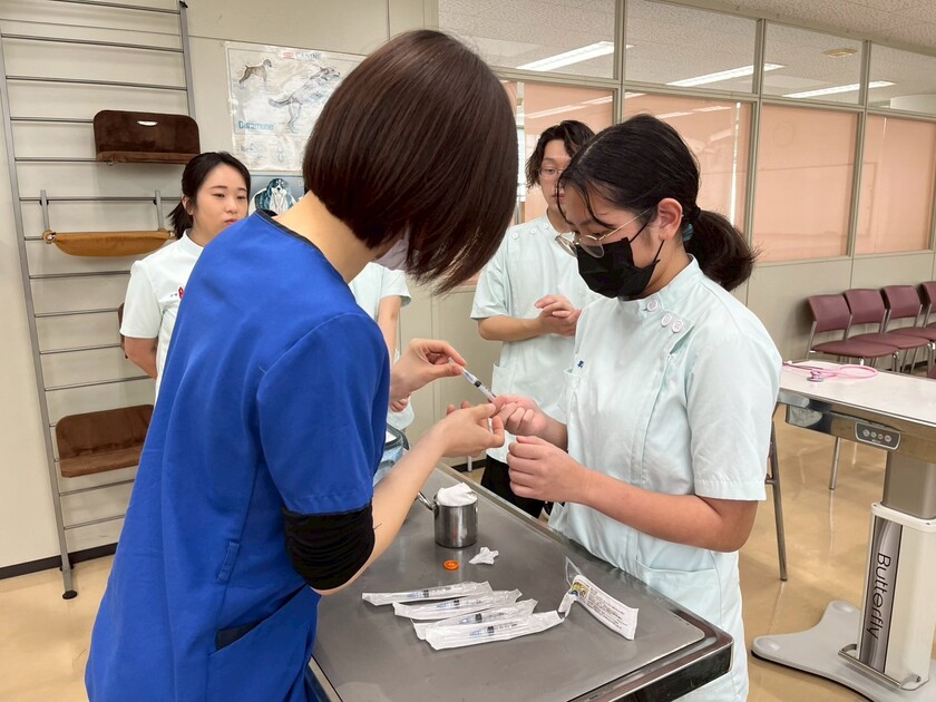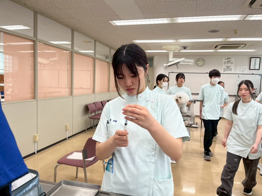 実習ではバイタルチェック、接種時の保定、カルテ記入まで一連の流れを体験しました。現役の専門家から直接指導を受けることで、実践的な技術を身につけます。