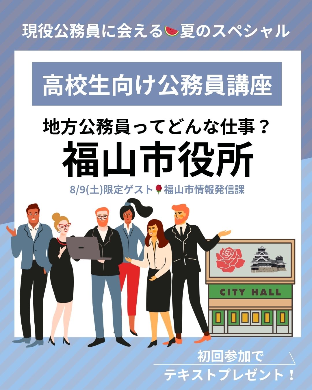 今年公務員受験をする人・来年以降の受験を考えている高校1・2年生はもちろん、公務員に興味のある人ならだれでも参加OKです。