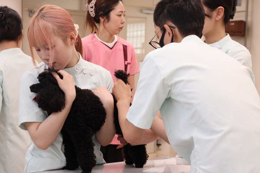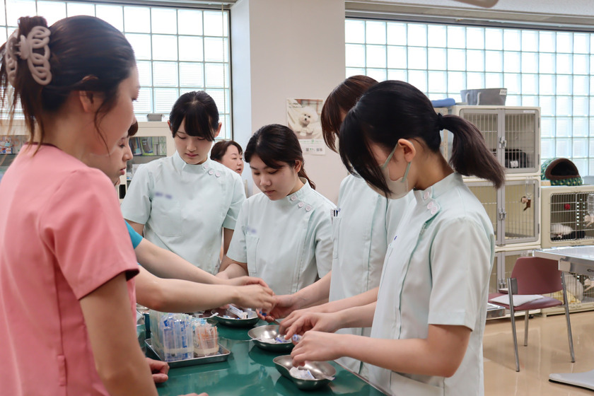 獣医師の先生立会いの下、学生たちは一連の流れを実践していきます。