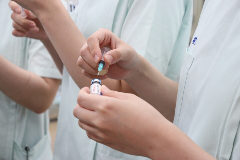 続いて注射器や消毒用脱脂綿などの器具を準備し、混合ワクチンを作ります。