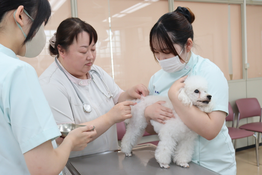 この日の実習テーマは「混合ワクチン接種」。いつも授業をお手伝いしてくれるスタッフ犬たちのために、学生たちが実際にワクチン接種を行います。