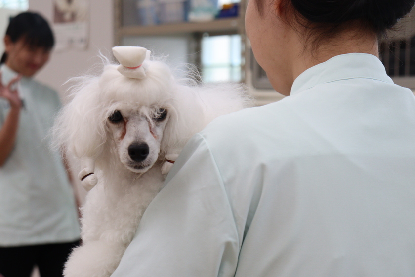 学生たちは獣医師の先生の手技も真剣に観察。躓いてしまったところや具体的なコツは、現場での経験が豊富な先生たちから随時フォローが入るので、安心して実践できます。