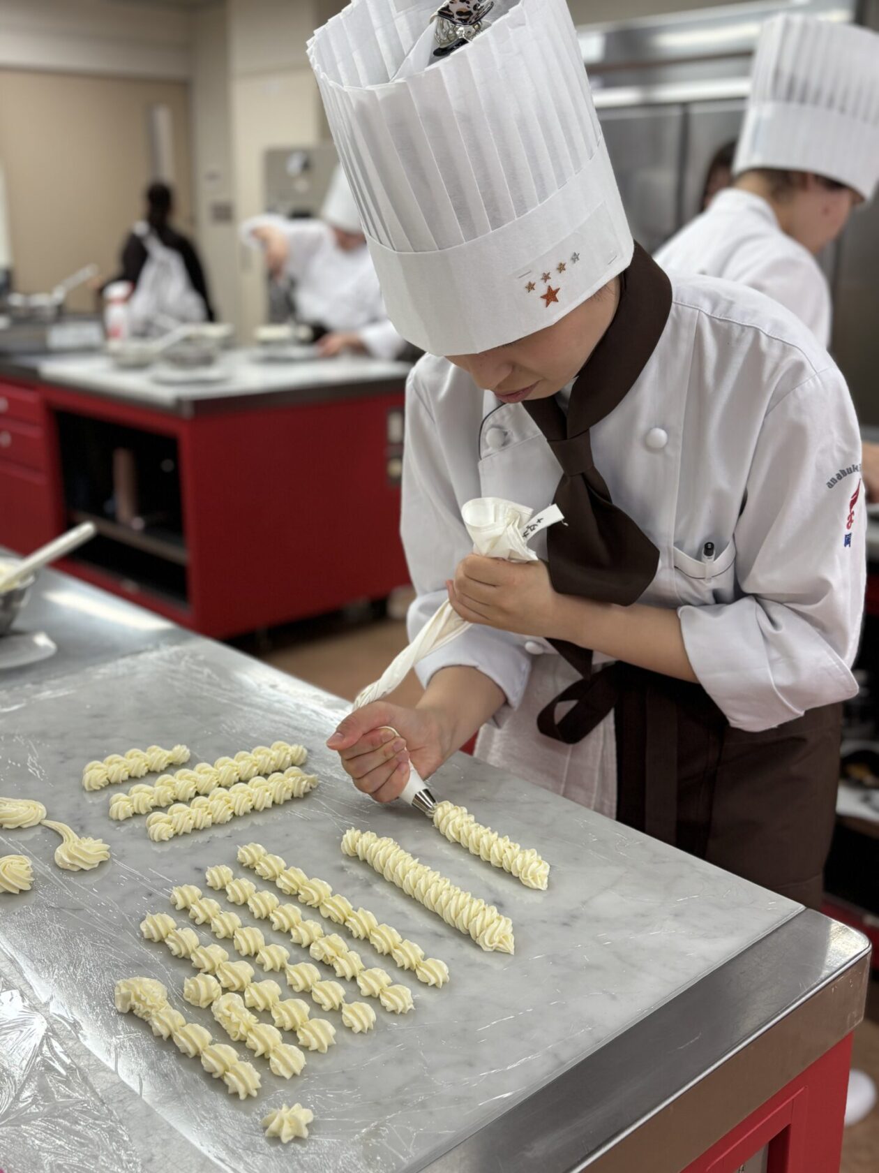 放課後の実習室には、真剣な表情で菓子作りの基本技術を磨く学生たちの姿がありました。アナブキでは、パティシエにとって不可欠なナッペ(クリームを均一に塗る技術)、パイピング(文字や模様を描く技術)、そして絞り(クリームを様々な形に絞り出す技術)の校内検定を実施しており、合格者には栄誉ある★マークが授与されます。
