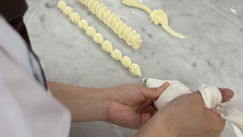 例えば、絞りでは、指示された様々な形に正確に絞り出せているか。ナッペでは、クリームが均一に、そして美しく塗られているか。そしてパイピングでは、プレートの幅に合わせてバランスよく文字が書けているか、そのほかの項目もありますが、しっかりと判定されます。