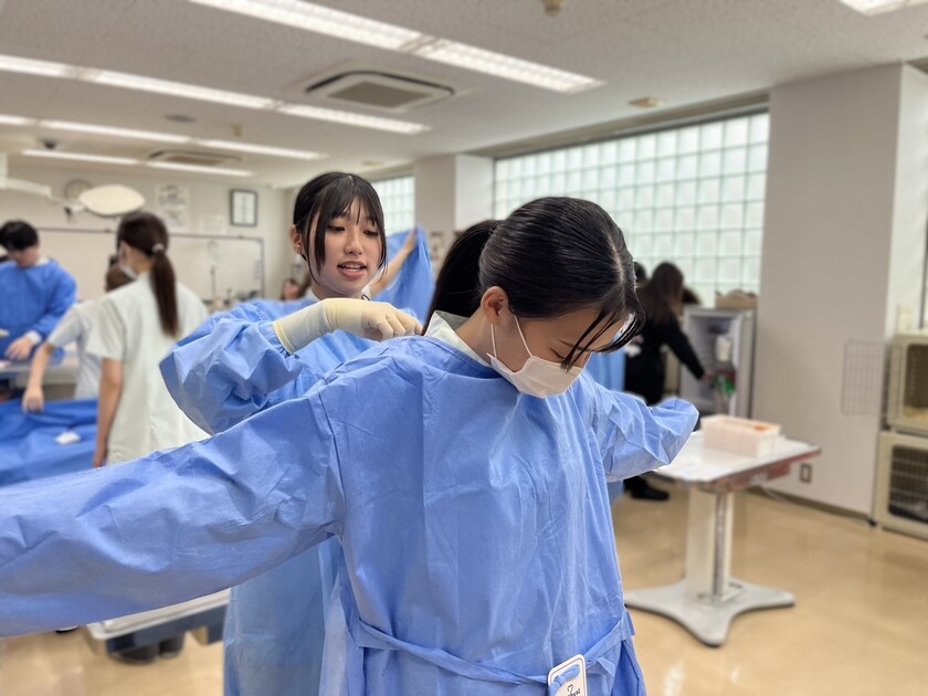 手術衣と滅菌グローブは、この清潔野を守る最も重要なバリアとなります。学生たちは真剣な表情で、でも楽しみながら、これらの技術を身につけました。