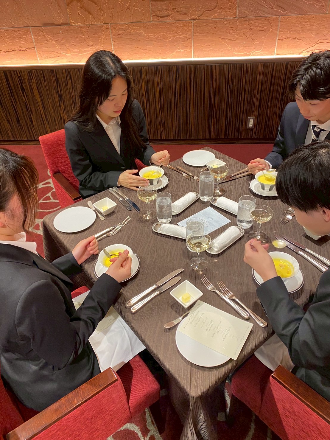 今回の研修では、ナイフやフォークの正しい使い方から、パンの食べ方、ナプキンの扱い方など、多岐にわたるテーブルマナーを学びました。