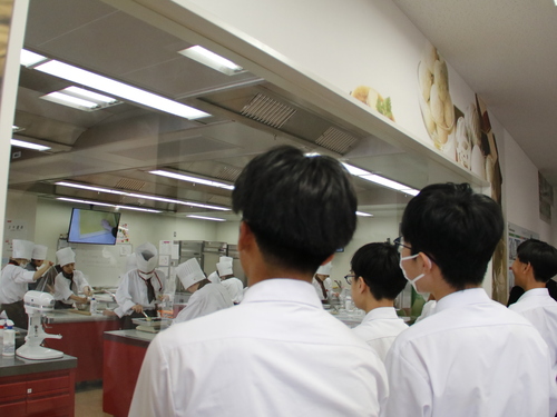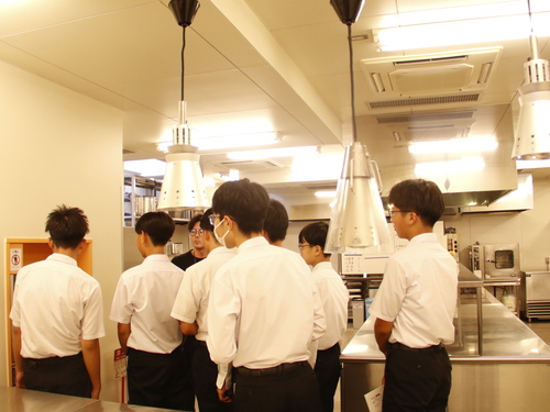 調理製菓系学科の校舎では、実習の様子や実習室を見て回り、すごい!かっこいい!おおきい!などみんな口々に感想を言っていました。