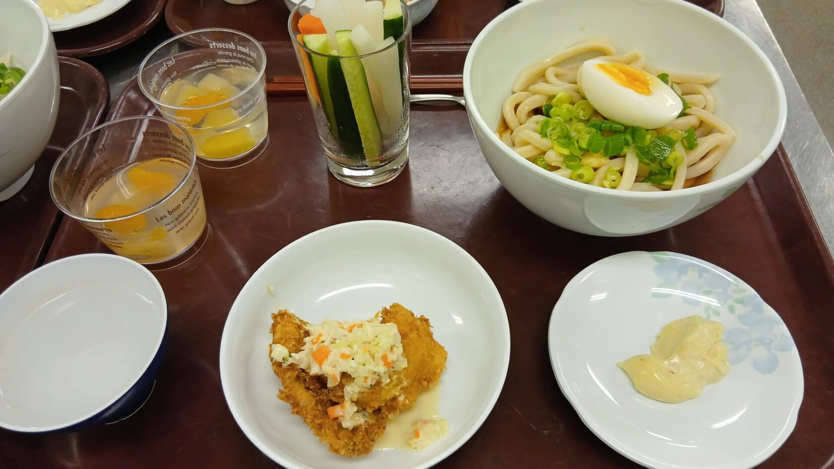 メニューはうどん・鯛のフライ・野菜スティック・ゼリーでした。