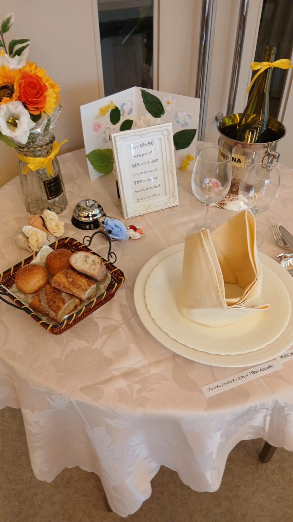話はそれますが、テーブルコーディネートの授業でレストラン実習室のテーブルが飾り付けられていました。