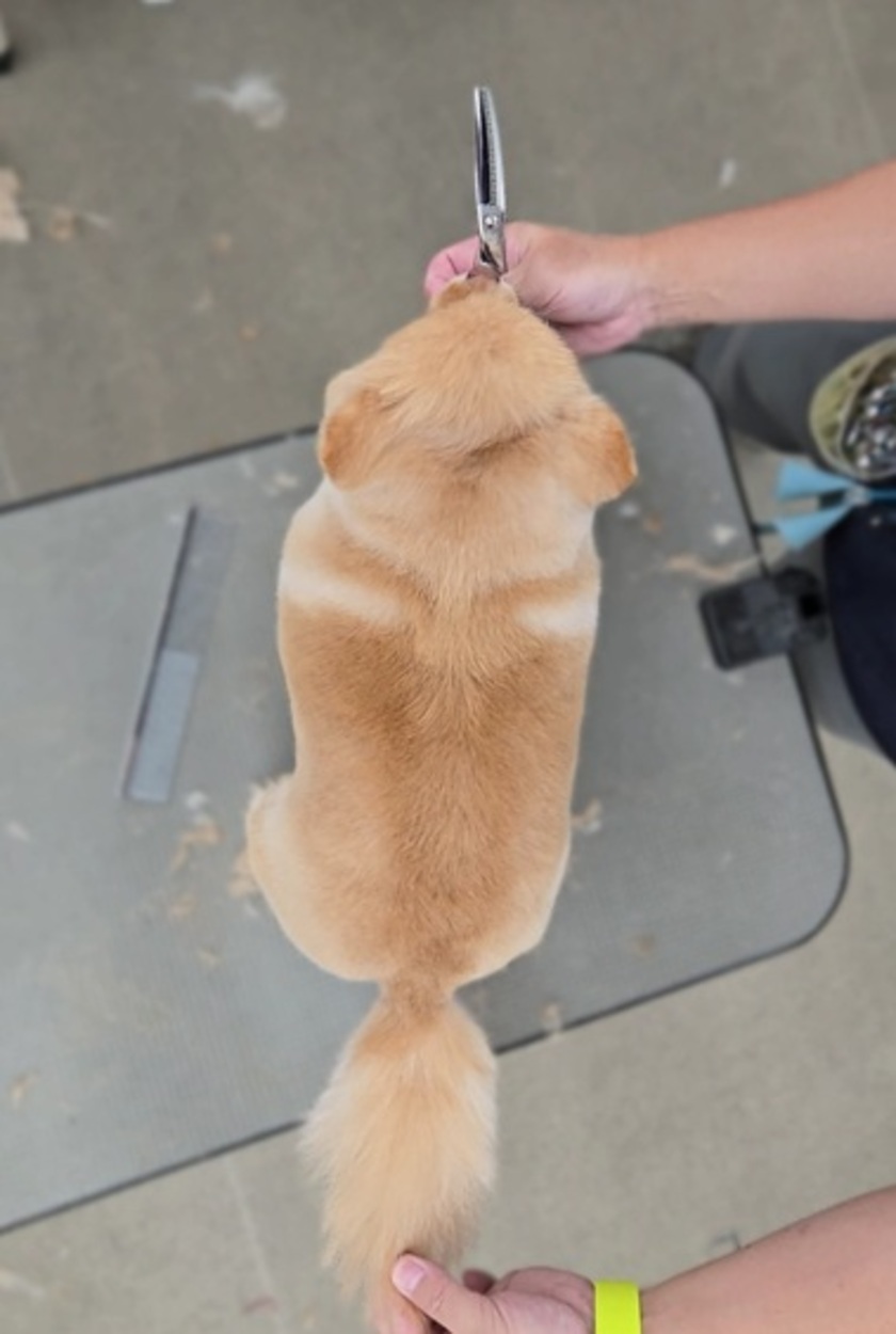 シバは柴犬カットとしてよく知られていますが、今日はふぅちゃんの身体の半分を「タヌキ」カット、半分を「キツネ」カットにして、その違いを分かりやすく見せてくれます。