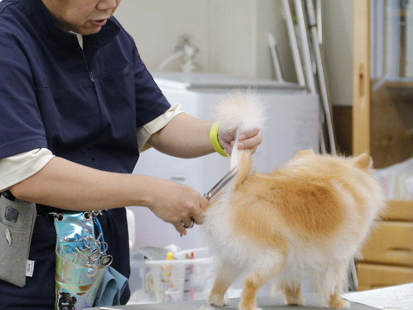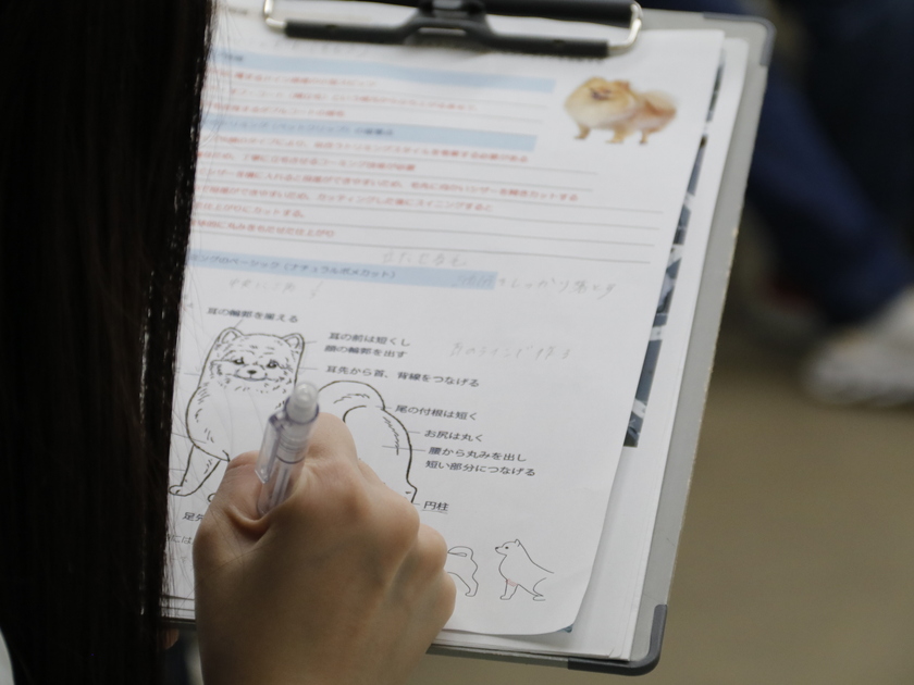 矢吹先生は各工程でのポイントや考え方はもちろん、ポメラニアンの犬種の特徴や飼い主様(お客様)とのコミュニケーションまで、惜しみなく教えてくれました。