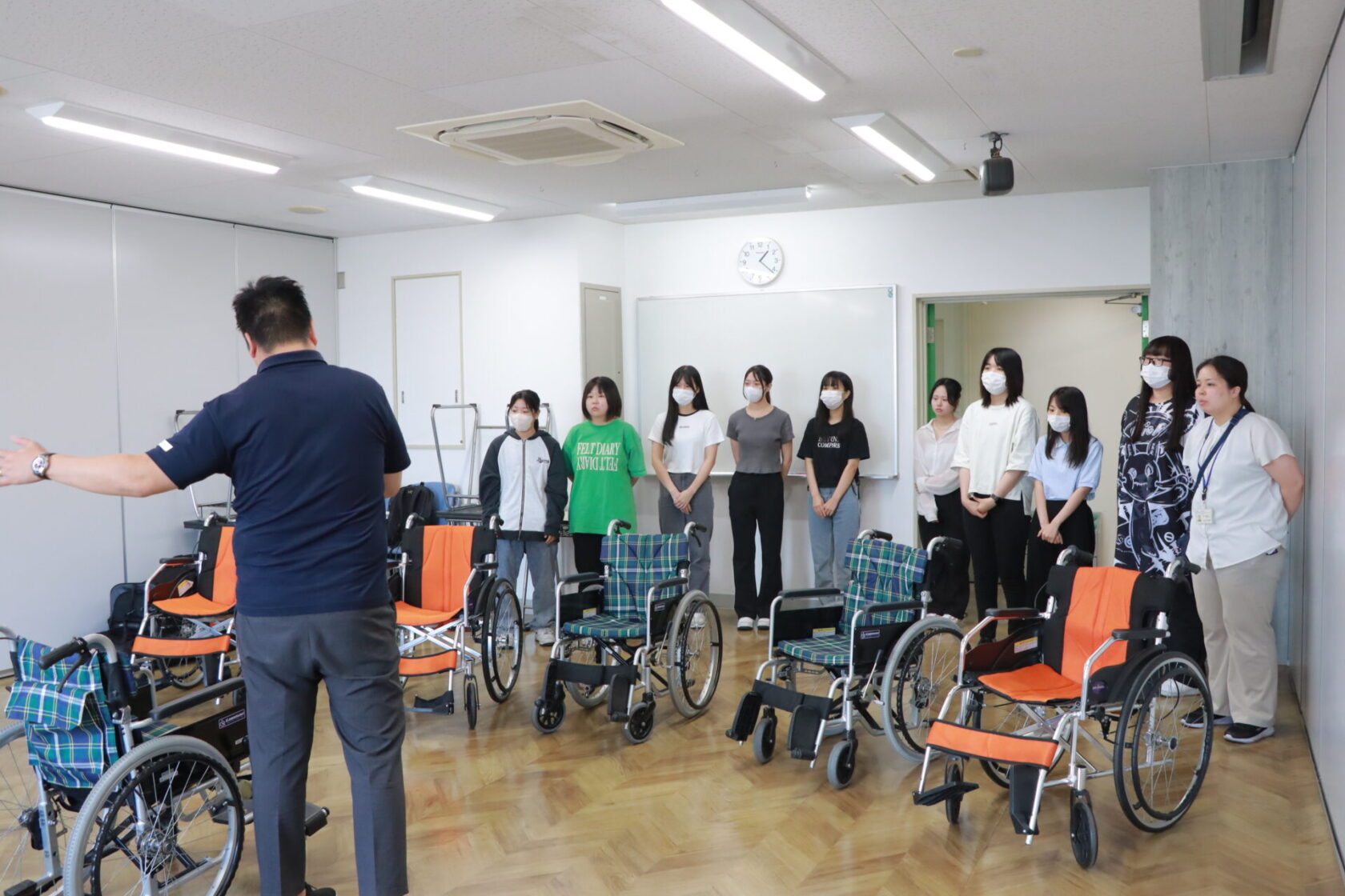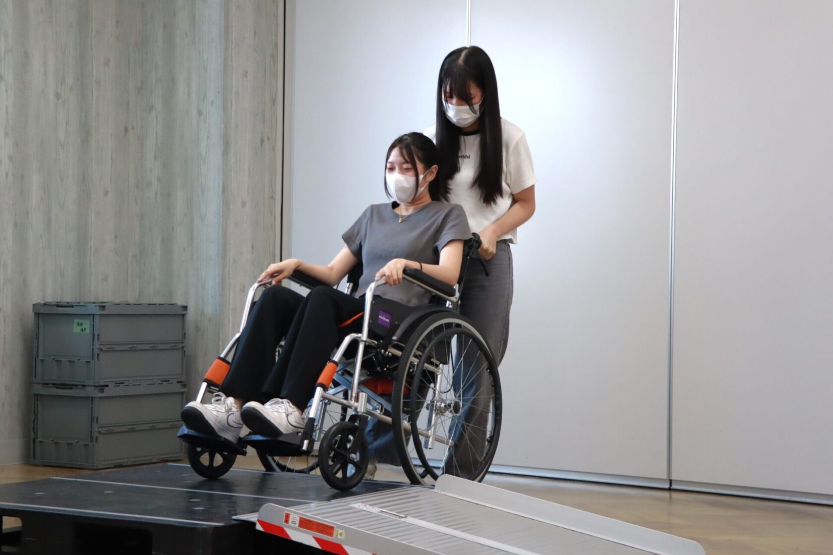 実際に車いすを使ってみたり、高齢者の身体機能を疑似体験するツールを使って体験してみます。
