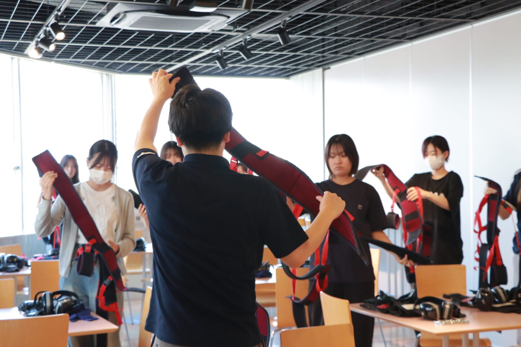 間接の動きを制限するベルトやゴーグル、イヤーマフ、手袋などを使って感覚を制限して疑似体験します。