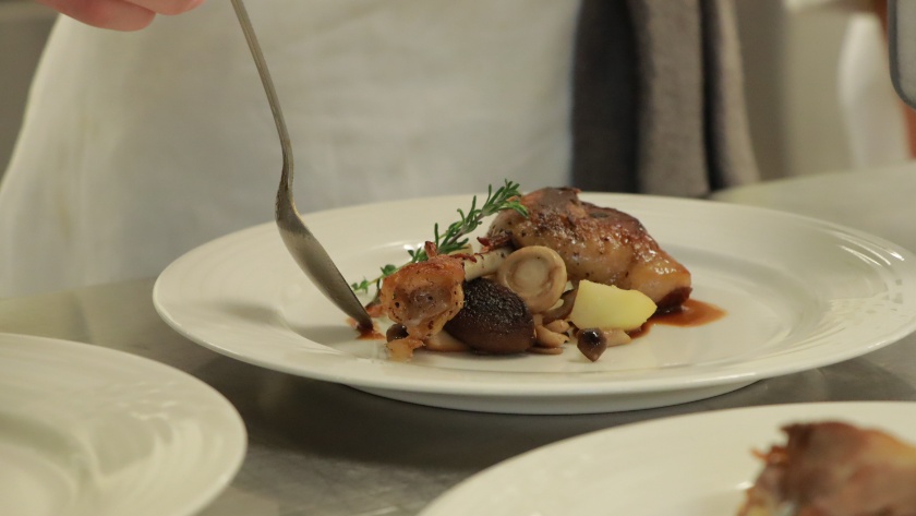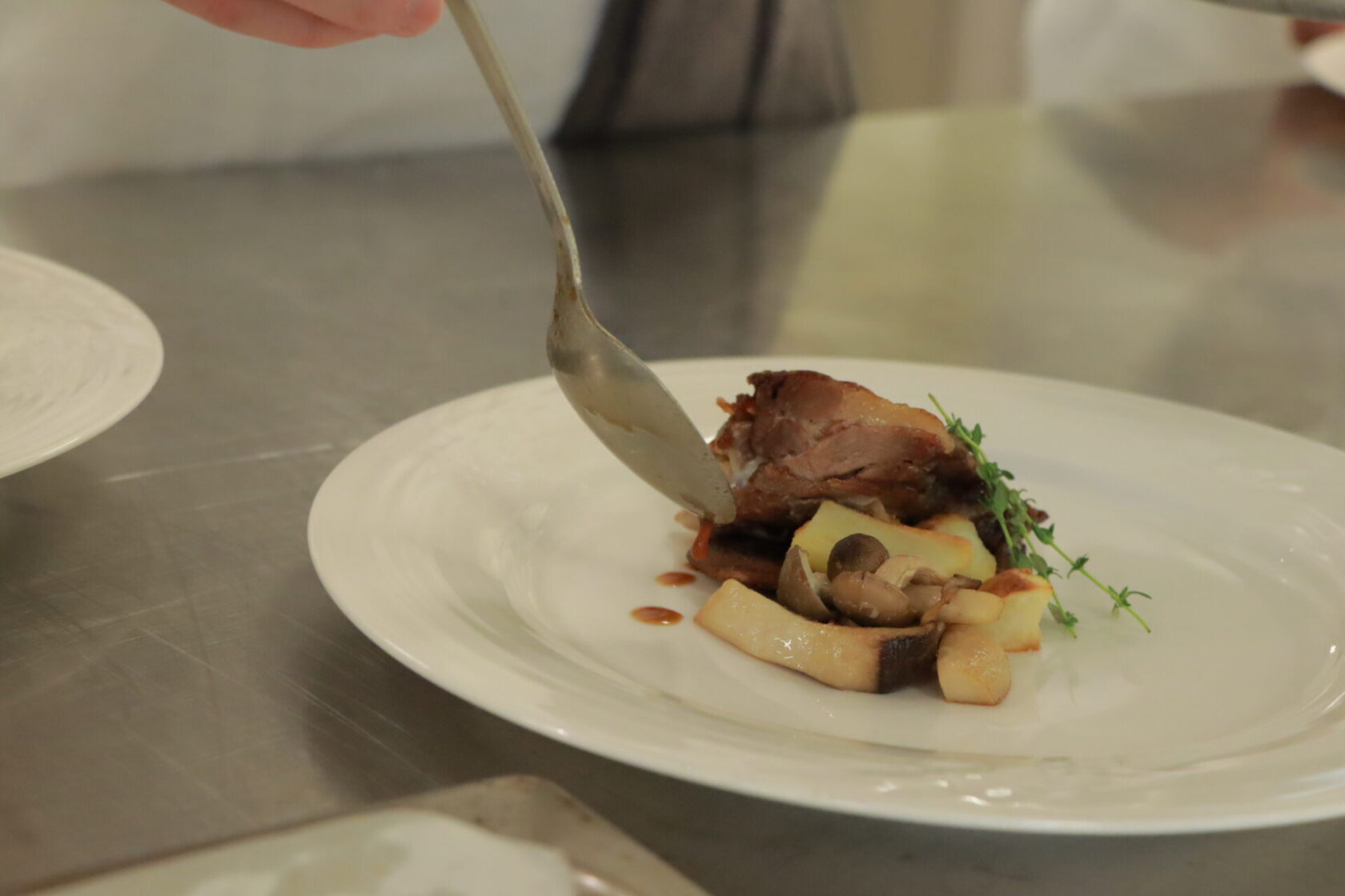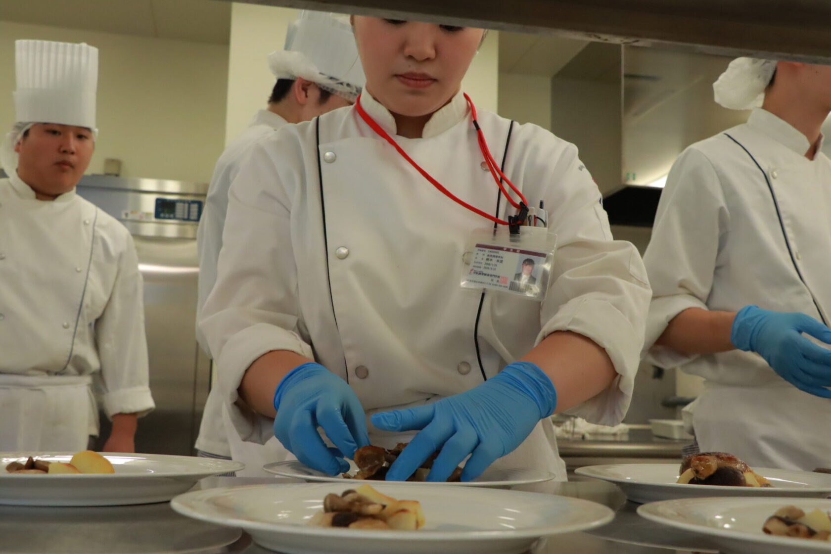 サービスからの連絡を受け、手際よく料理を仕上げていきます。
