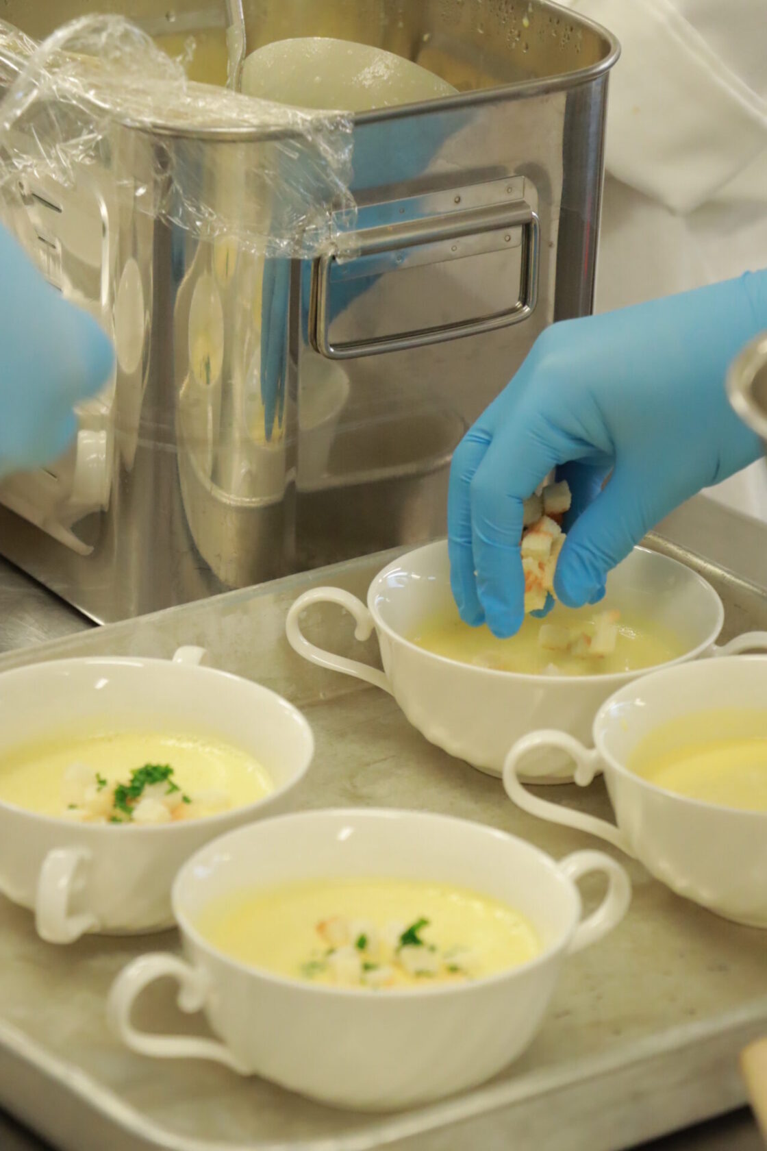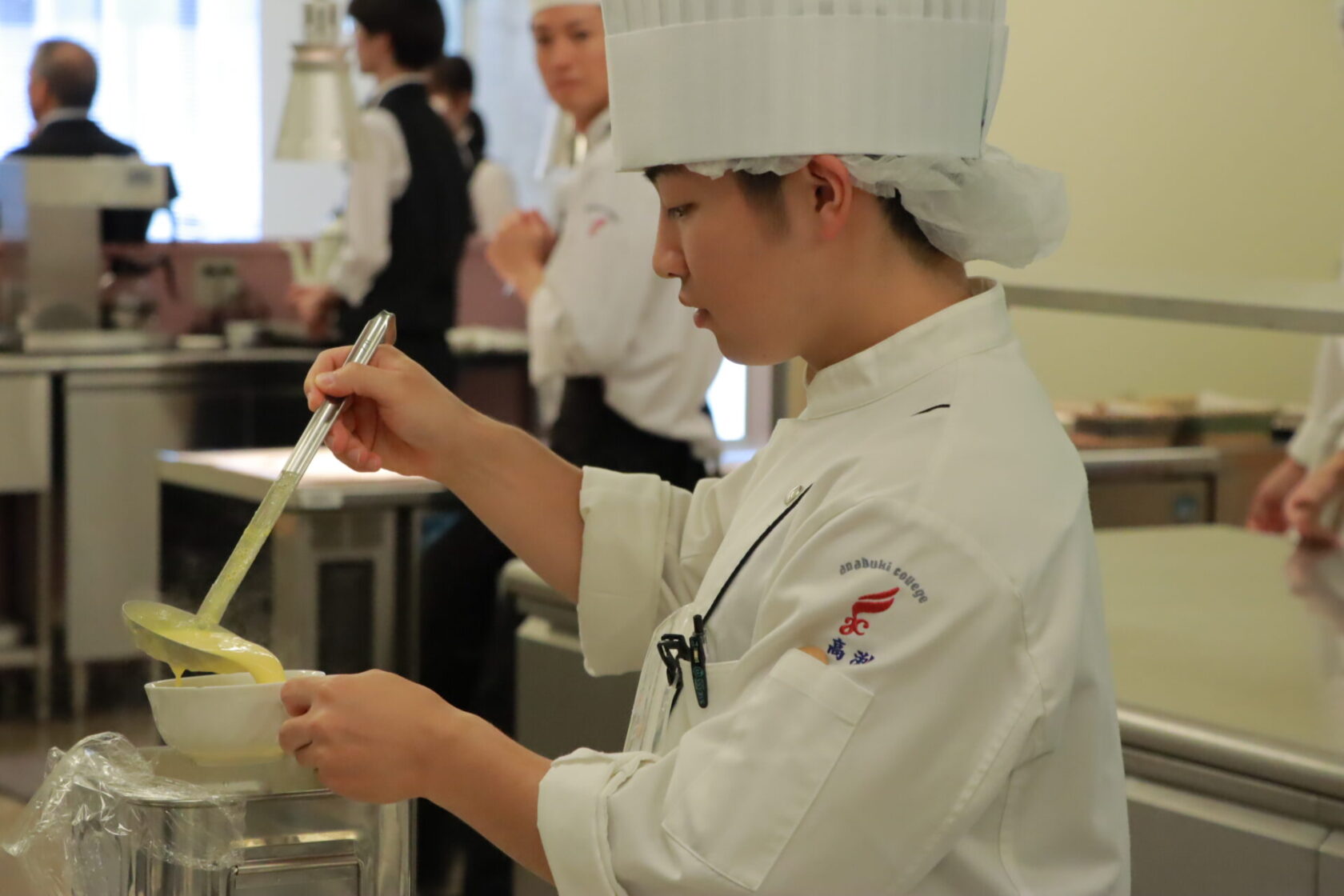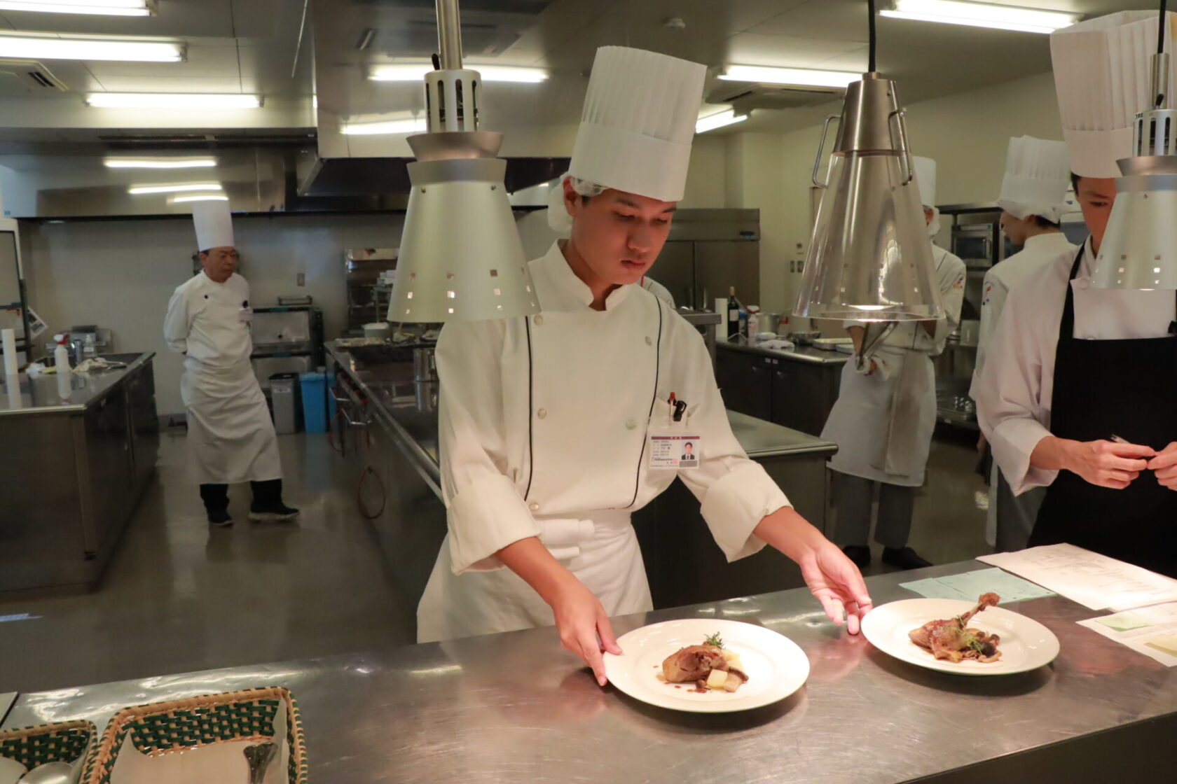 毎週金曜日に西洋料理と日本料理の専攻チームが、自分たちで作った料理を教職員に提供します。まずは西洋料理チームが調理担当、日本料理チームがサービスを担当して、今年度初のレストラン実習に挑みました!