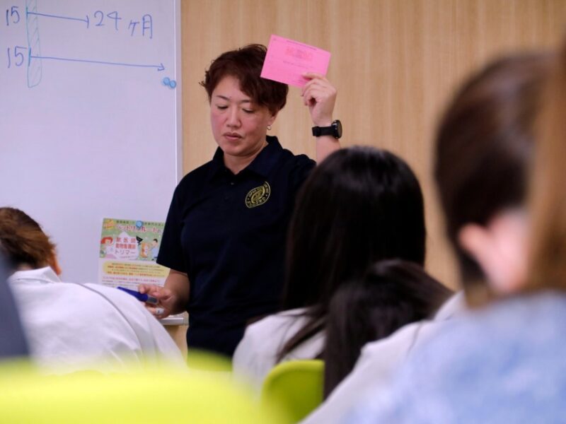 学生たちは真剣な表情でメモを取り、配布資料を読み込みます。