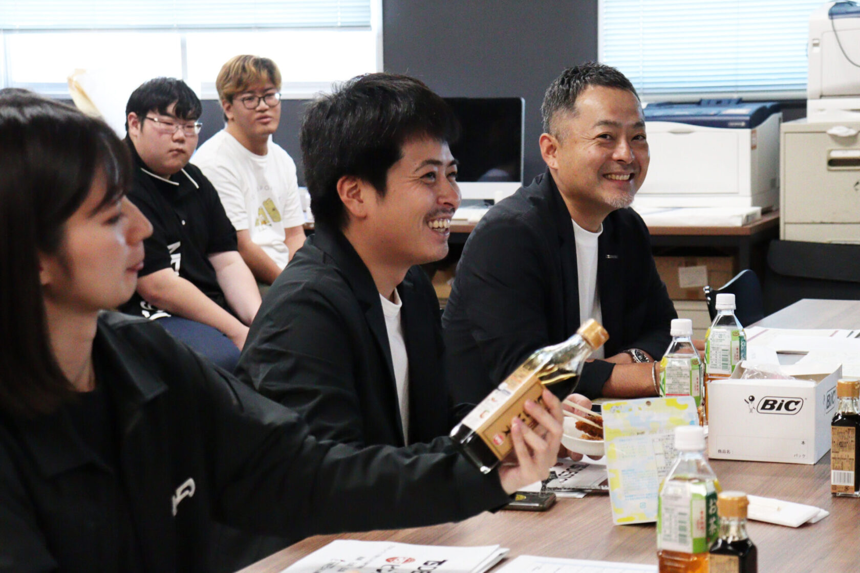 まず学生たちは、牡蠣醤油やビンゴソースなどといった地元の商品をピックアップし、学生本人がその販売元・製造会社様にアポ取りをするところからスタート!そして自ら会社に訪問させていただきお打ち合わせをさせていただきました。