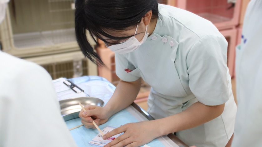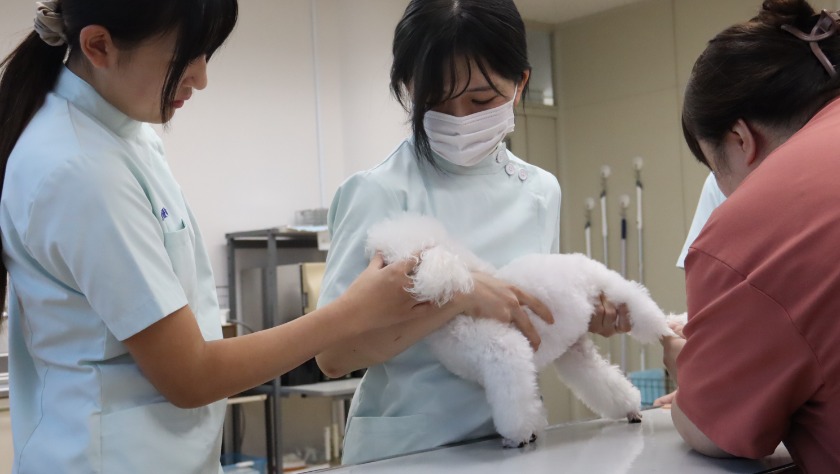 動物を落ち着かせるための保定(優しく支えること)や、採血後のケアなど、動物看護師の基礎的で重要な役割を実践します。