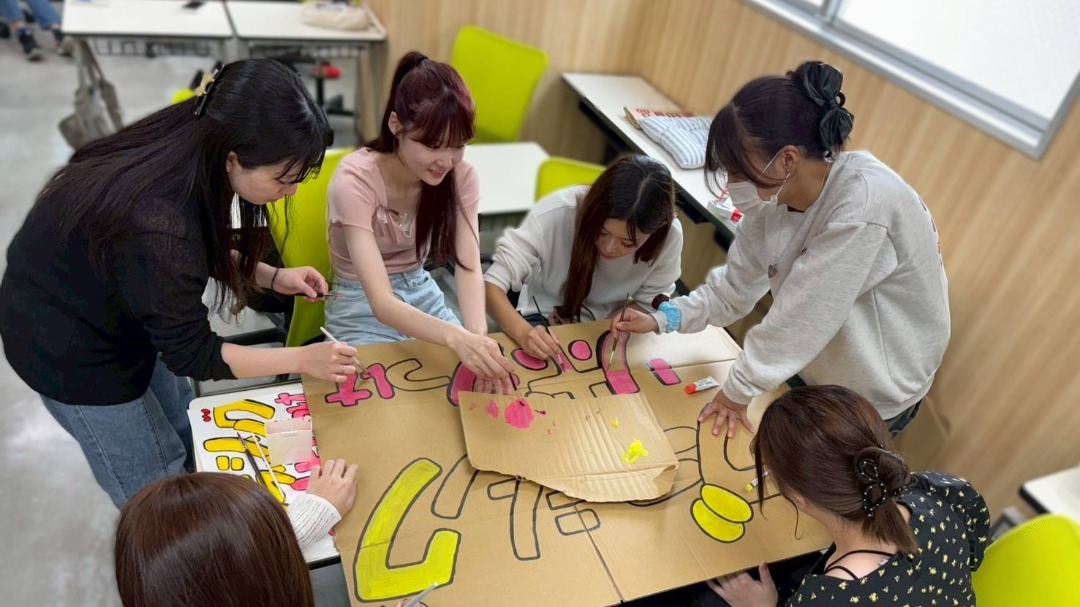 教室では、体験ブースの大きな看板や、わんちゃん用の可愛い撮影スポットを制作中。