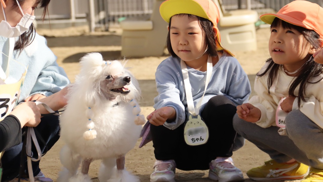 学生のサポートのおかげで、子どもたちはわんちゃんを撫でて嬉しそうな表情を浮かべたり、一緒にお散歩体験を楽しんだりと、園庭には穏やかで幸せな空気が流れていました。