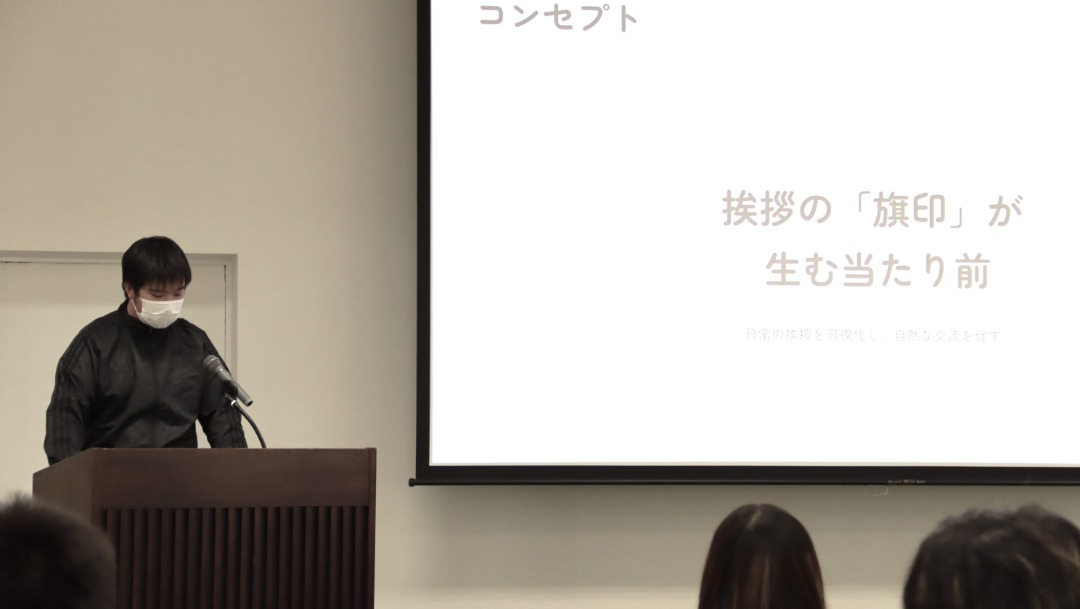 また別のチームは、アルバイトなどの社会経験から「人と人との関わり」の大切さを再確認し、「挨拶」を仕組み化して増やすことでコミュニティを活性化させるサービスを考案しました。