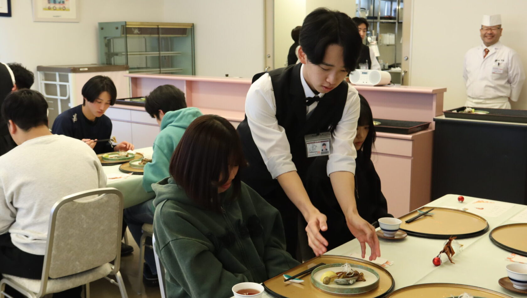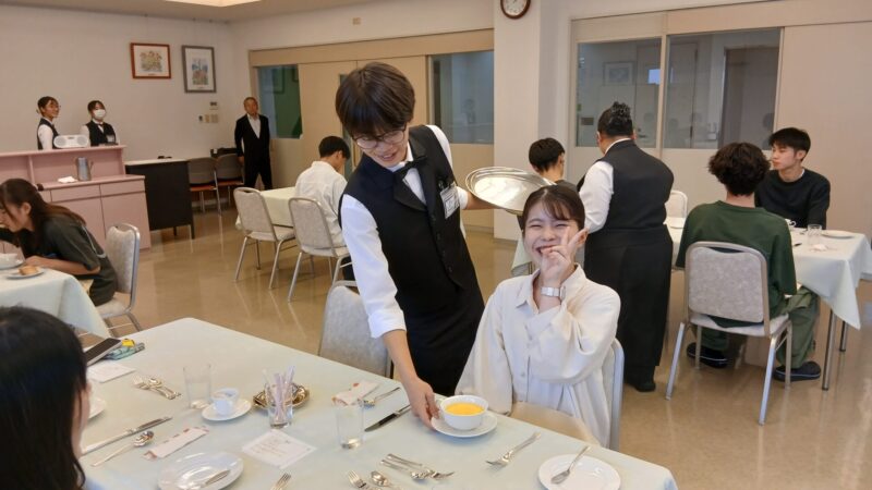 今回、生徒たちは教職員に加え、日頃支えてくださっている保護者の方々もお客様としてお招きし、料理とサービスを提供しました。これは、学校の実習でありながら、お客様の期待に応えるプロの責任を強く意識する貴重な経験です。