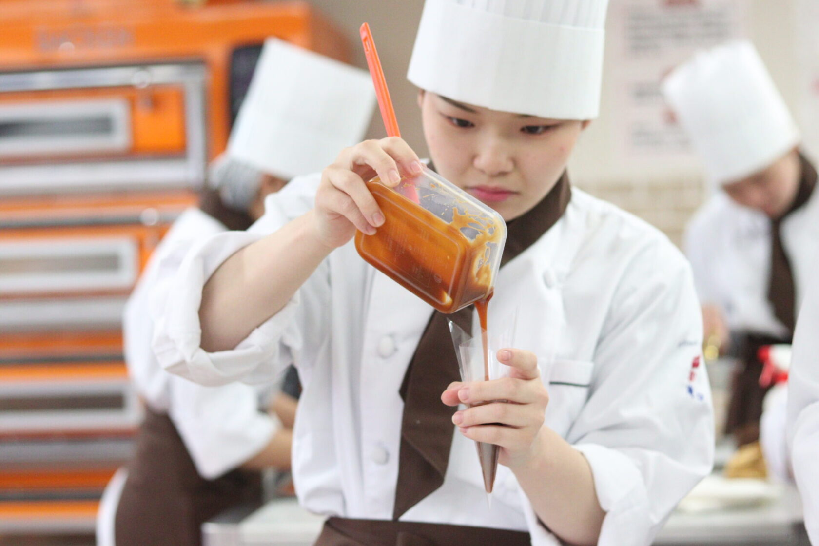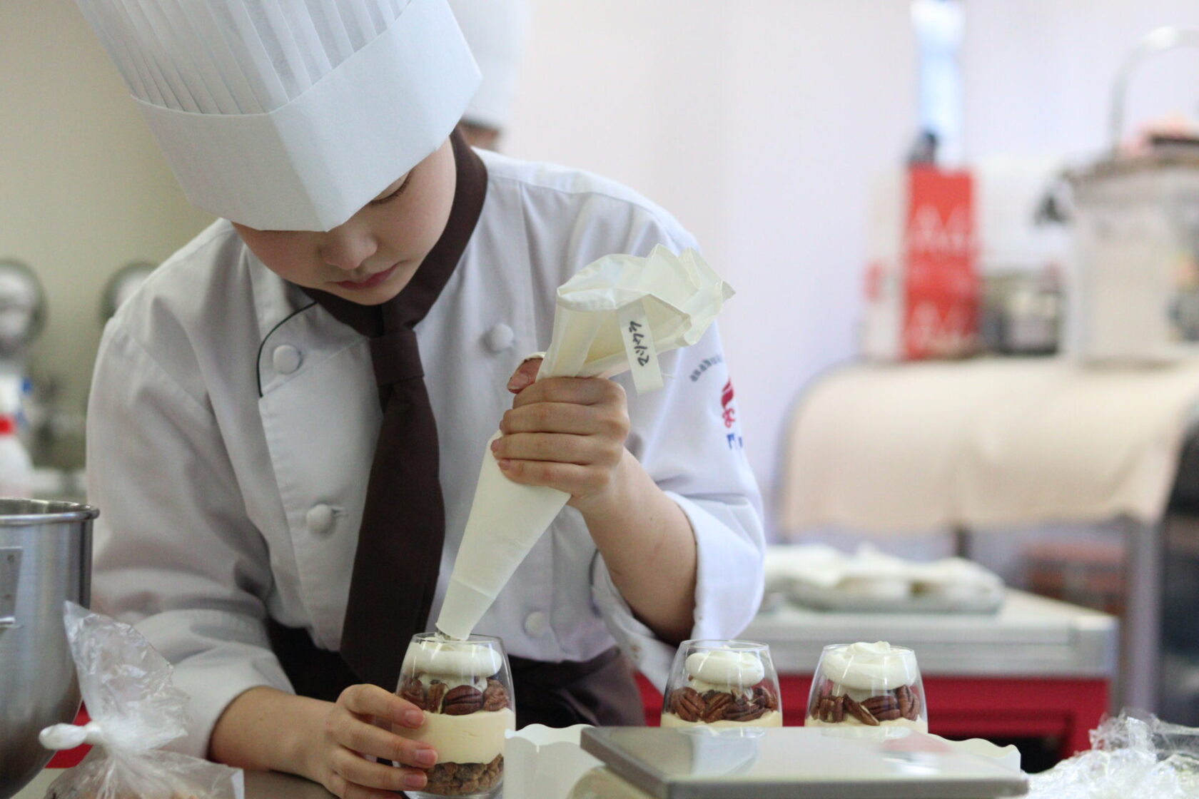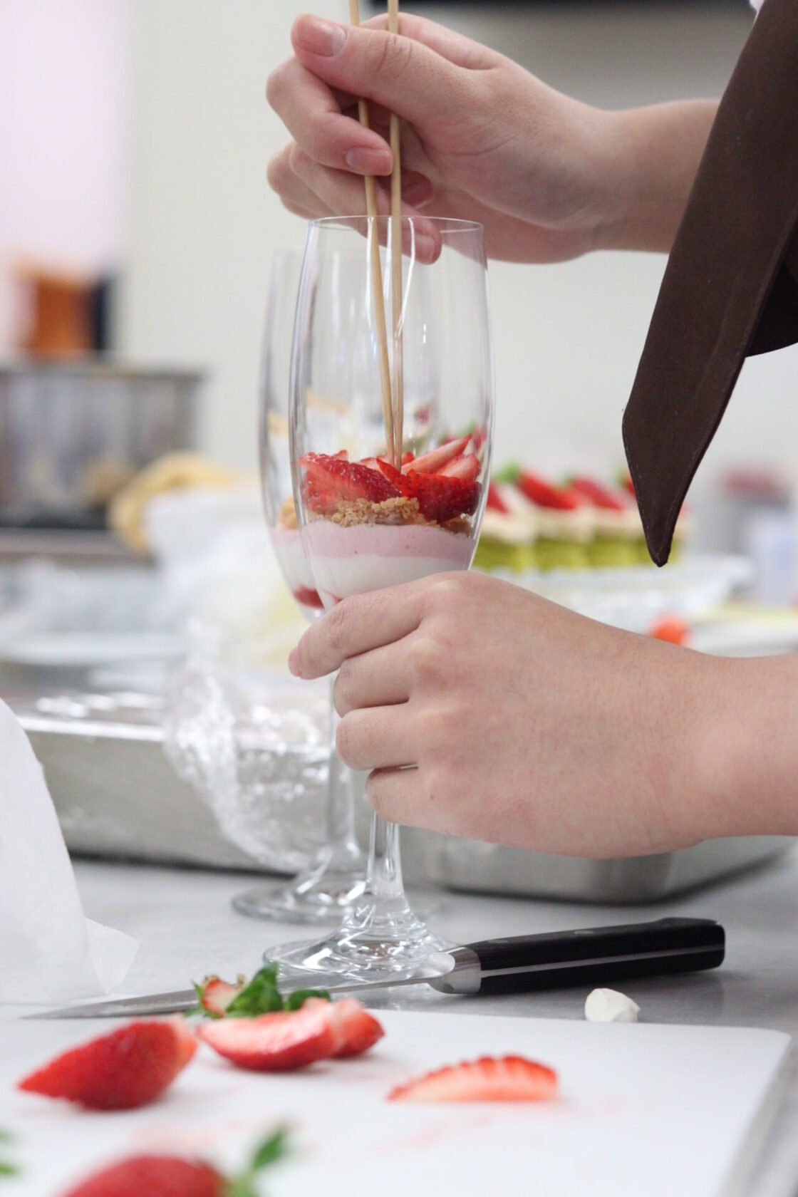 グラスデザートにクリームを絞り出したり、キャラメルソースを慎重に型に注ぎ込んむその真剣な表情からは、プロ意識が伝わってきます。