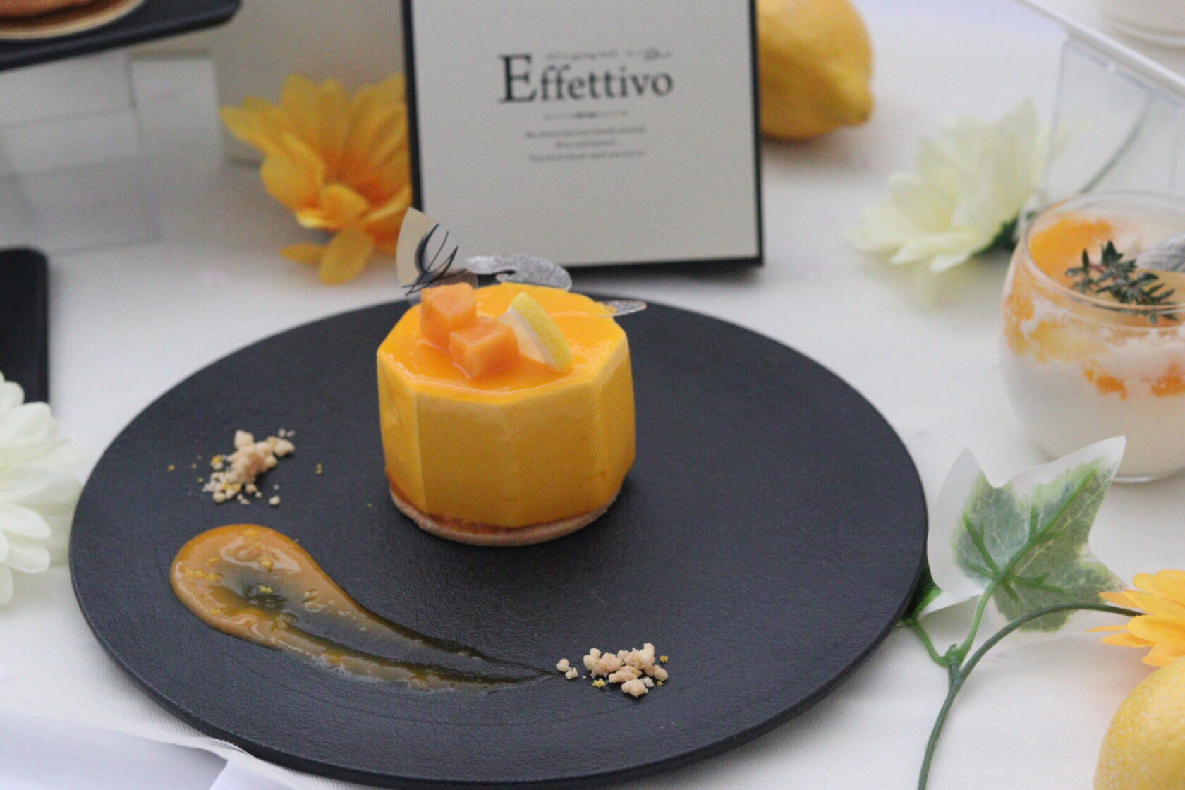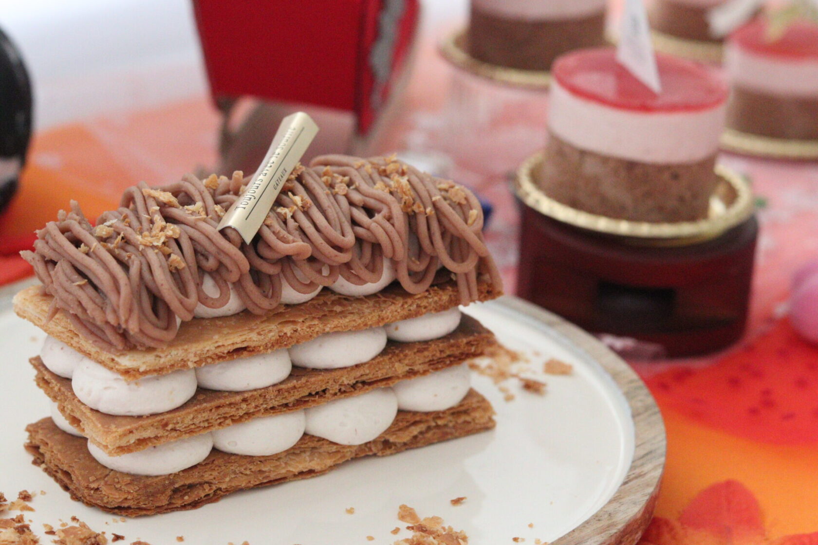 美しく層になったモンブラン風のケーキや、マンゴーのグラサージュが輝くケーキ、そしてシックなチョコレートケーキなど、一つひとつの作品から、細部までこだわった技術が感じられます。