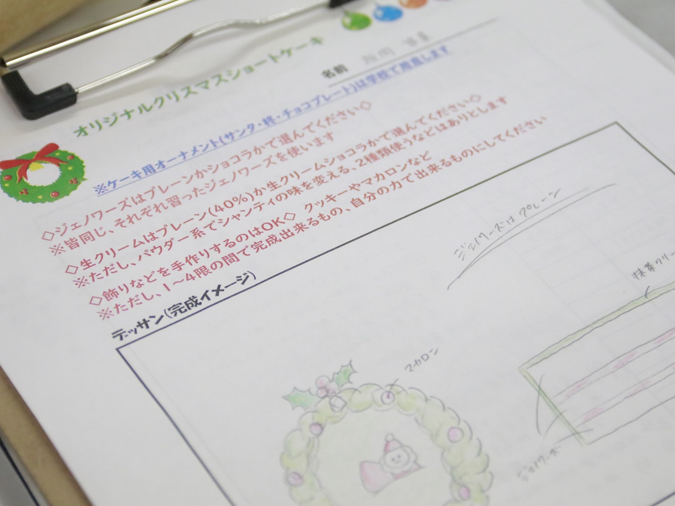 実習室を覗くと、学生たちの手元には細かく書き込まれた用紙がありました。そこには、カラフルな色鉛筆で描かれたケーキの完成イメージが。