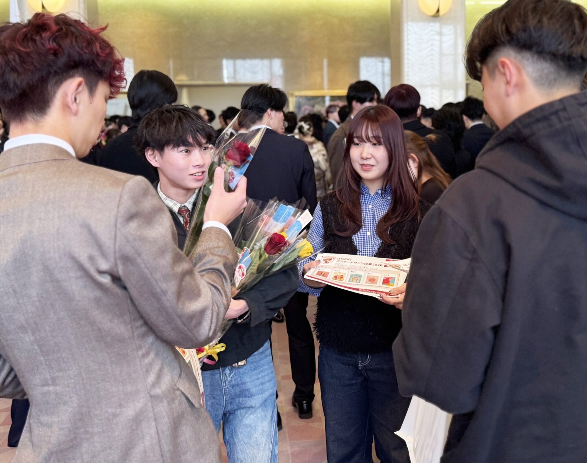 この度、本校デザイン学科の学生が制作した「ばらの日ポスター」から5作品が選ばれ、その最終投票が福山市の二十歳の集いで行われました!今回は制作した1年生たちが投票の呼びかけ等のお手伝いをさせていただき、たくさんの方にご投票いただきました。(さらに二十歳の集いに参加していた2年生たちも!みんなもうすっかり大人ですね〜!みなさんおめでとうございます!)