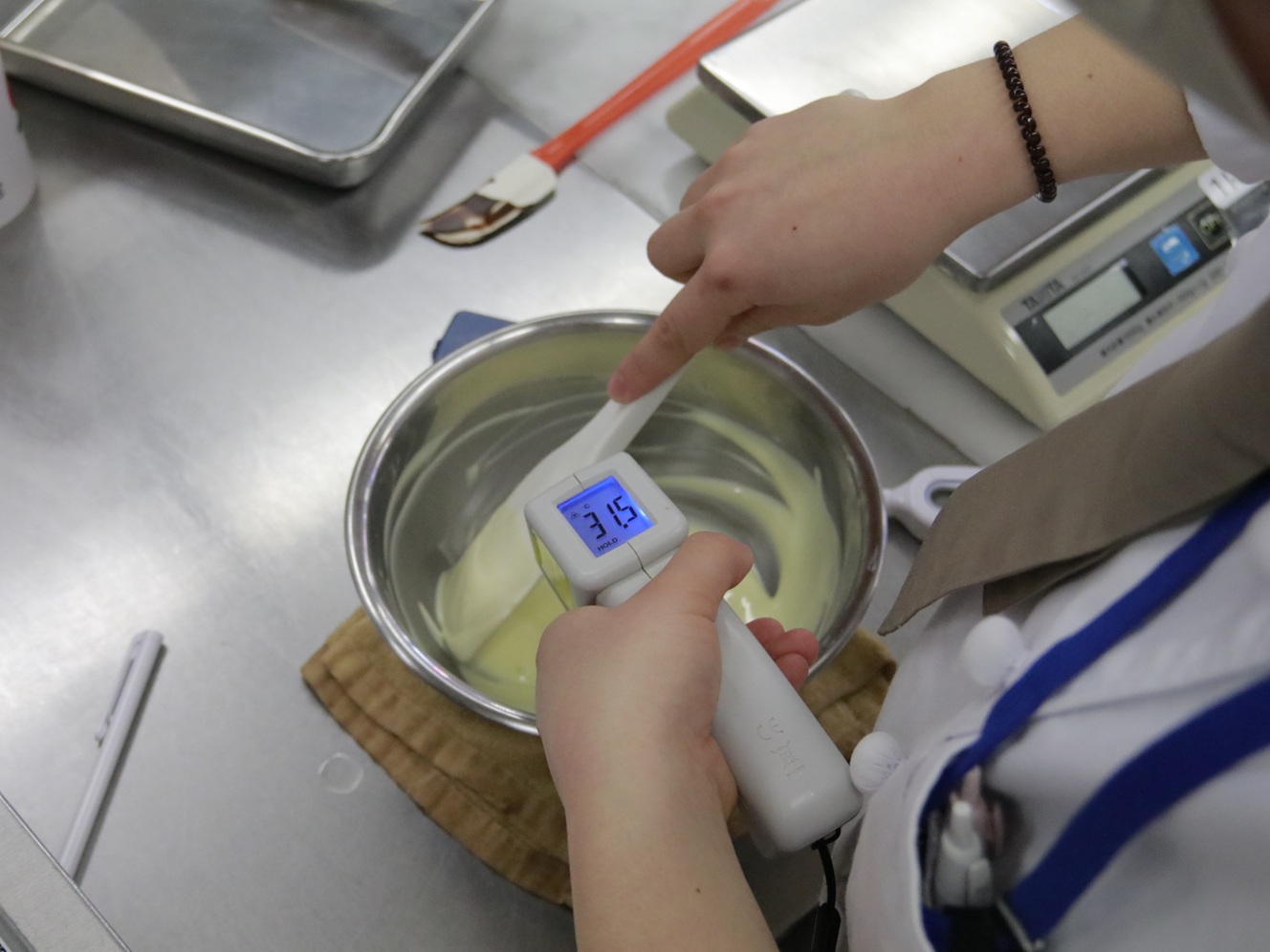実習室では、プロが使う道具を使って、温度計を片手に慎重にチョコを練り上げていきます。一見難しそうに見えますが、先輩や先生が優しく教えるので安心してくださいね!