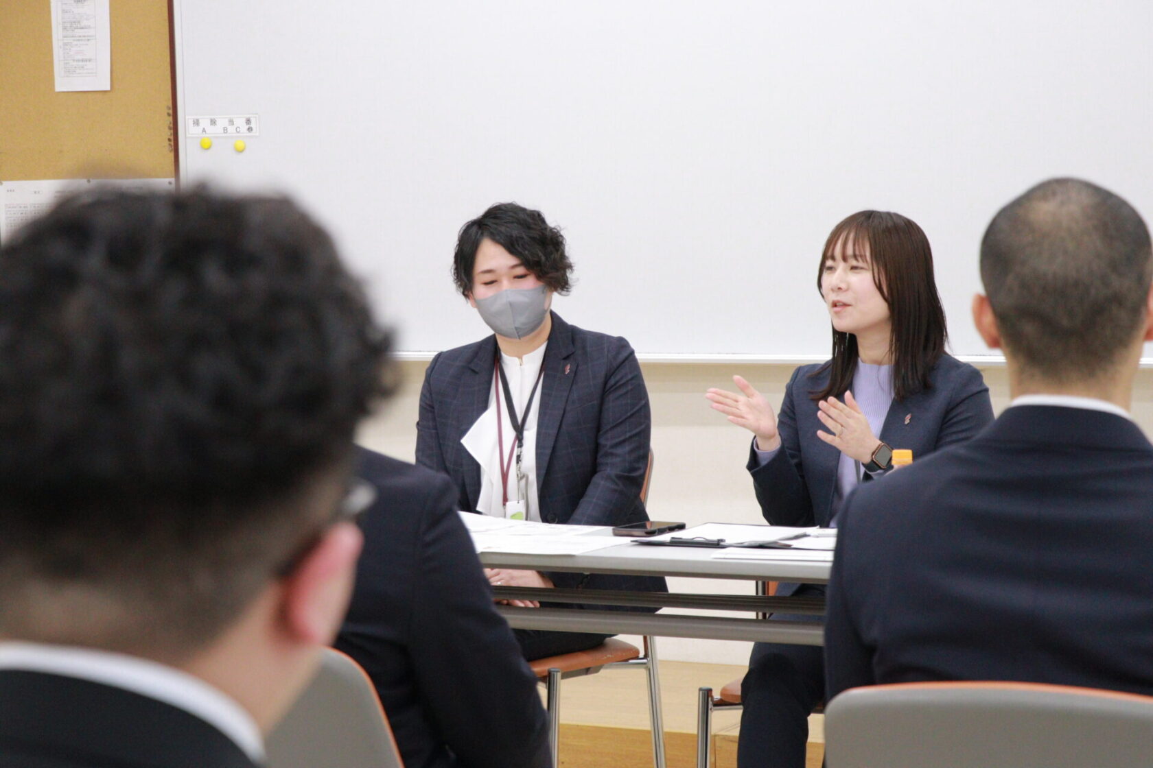 面接後には一人ひとりに対してフィードバックの時間が設けられ、話し方や表情、伝え方について具体的なアドバイスが行われました。学生たちは、「あらかじめ話たい内容を考えていても、実際に面接の雰囲気になると言葉が出なくなった」、「話したいことが飛んでしまい、頭が真っ白になってしまった」など、反省の言葉を口にする学生もいました。