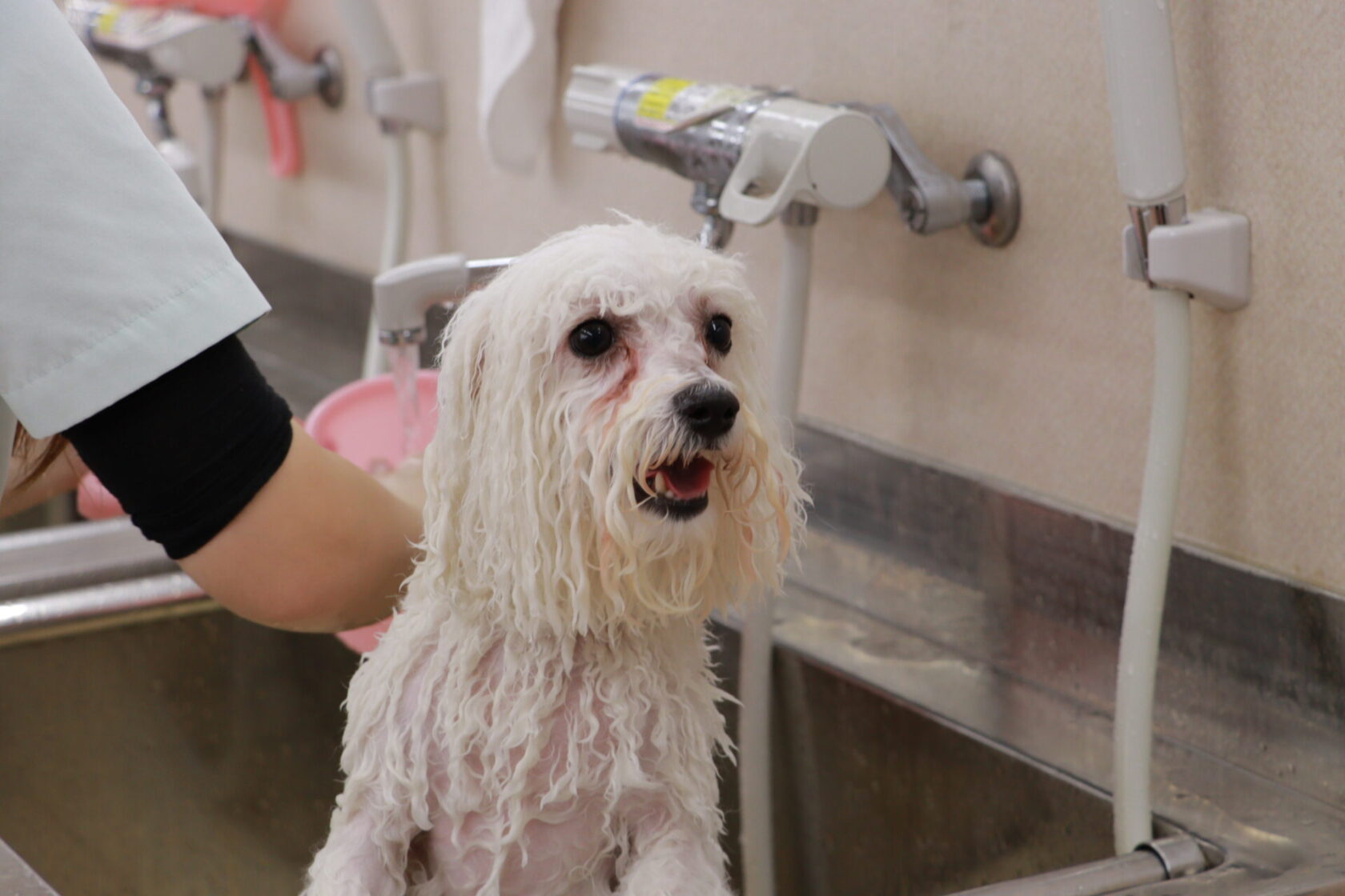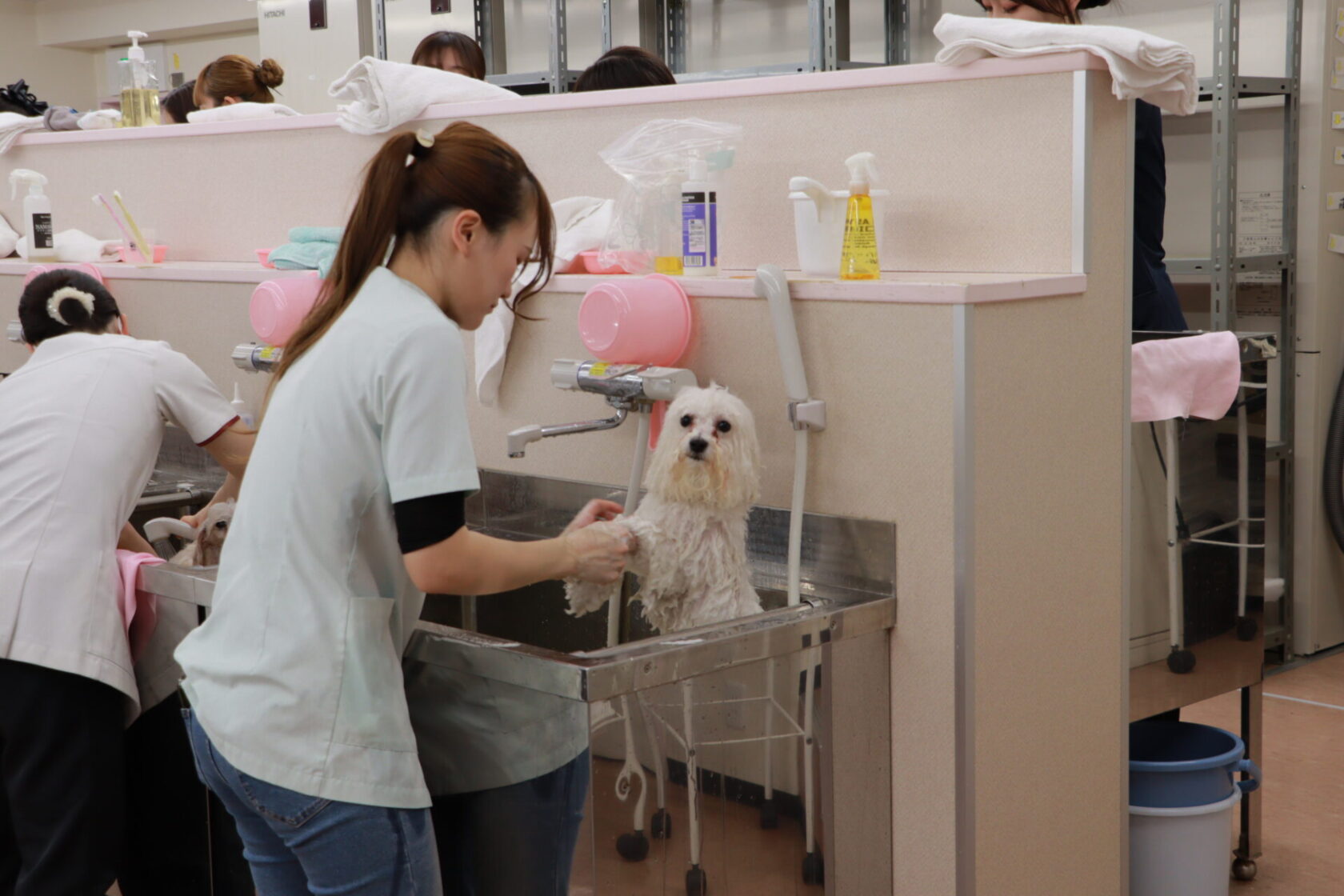 使い慣れないトリミング台やシャンプー施設に戸惑いながらも、学生たちはこれまでの成果をぶつけました。
