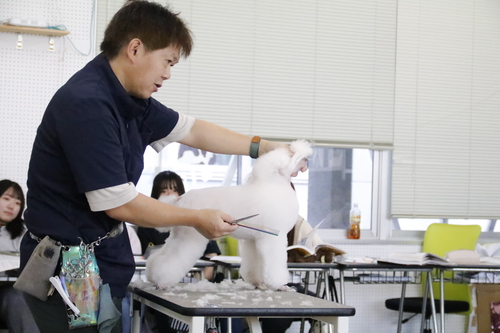 テディベアカットに挑戦!デザインカットのデモンストレーション(動物健康美容学科)