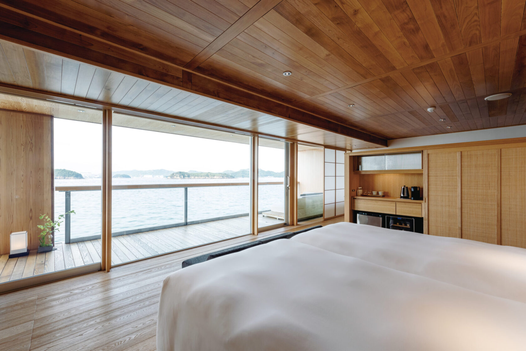 建築家・堀部安嗣氏が設計した船内は、わずか17室の全室テラス付きの客室に加え、「お好きなものを、お好きなだけ」がコンセプトのダイニング、海の見える鮨カウンター、檜の浴槽とサウナを備えた浴場など、贅沢な空間が広がります。