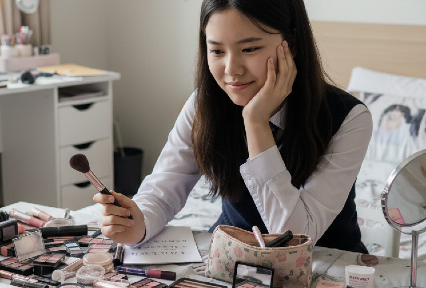 ベースメイクでは、ファンデーションを厚く塗りすぎないこと。薄くのばし、必要な部分だけコンシーラーを使って整えると、素肌感を残した自然な仕上がりになります。チークやハイライトはほんのり色づく程度で十分です。